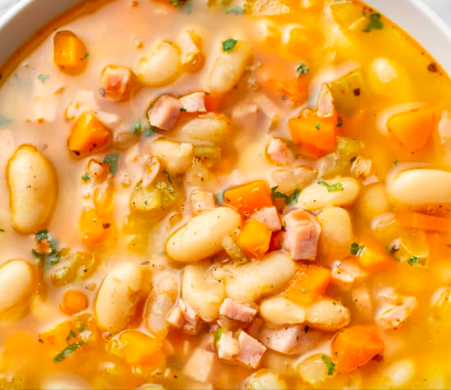 Diced Ham, White Beans, Fire Roasted Tomatoes, Sautéed Kale, Carrots and Celery Served in a Flavorful Vegetable Ham Stock.